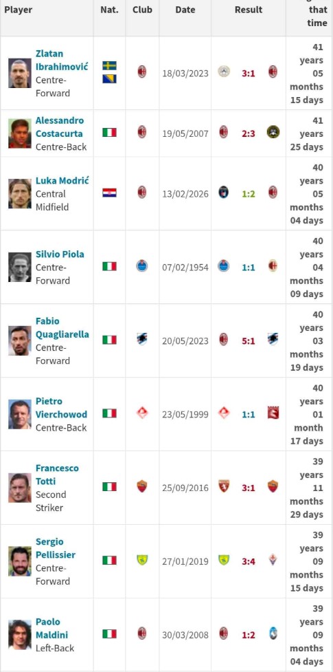 Единствените двама по-възрастни голмайстори от Модрич са също бивши играчи на Милан – Златан Ибрахимович и Алесандро Костакурта. Ибрахимович бележи последния си гол в Серия А на 41 години, пет месеца и 15 дни, а Костакурта – на 41 години и 25 дни. Това означава, че Модрич няма възможност този сезон да надмине нито един от двамата.