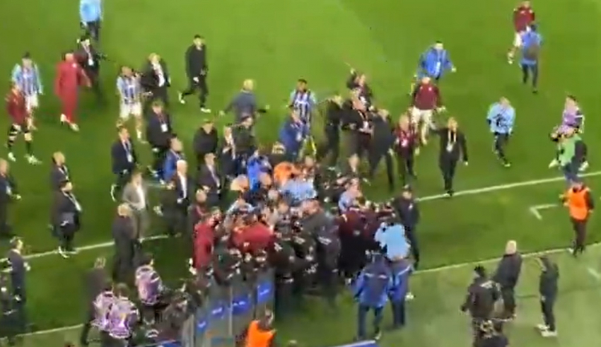 Истински хаос настана на дербито от турското първенство между Трабзонспор и Галатасарай. Домакините победиха с 2:1, но последваха сцени на пълен хаос на терена и извън него.